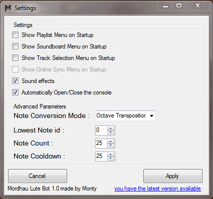 Это меню необходимо для настройки определенных параметров, например, какие окна будут открываться при запуске. В настройках звуковых эффектов доступен вариант использования стандартного Midi-проигрывателя от Windows по умолчанию (это крайне важно при настройках выбора проигрываемых инструментов). По выбору доступен автоматический запуск и закрытие консоли, во время воспроизведения музыки.